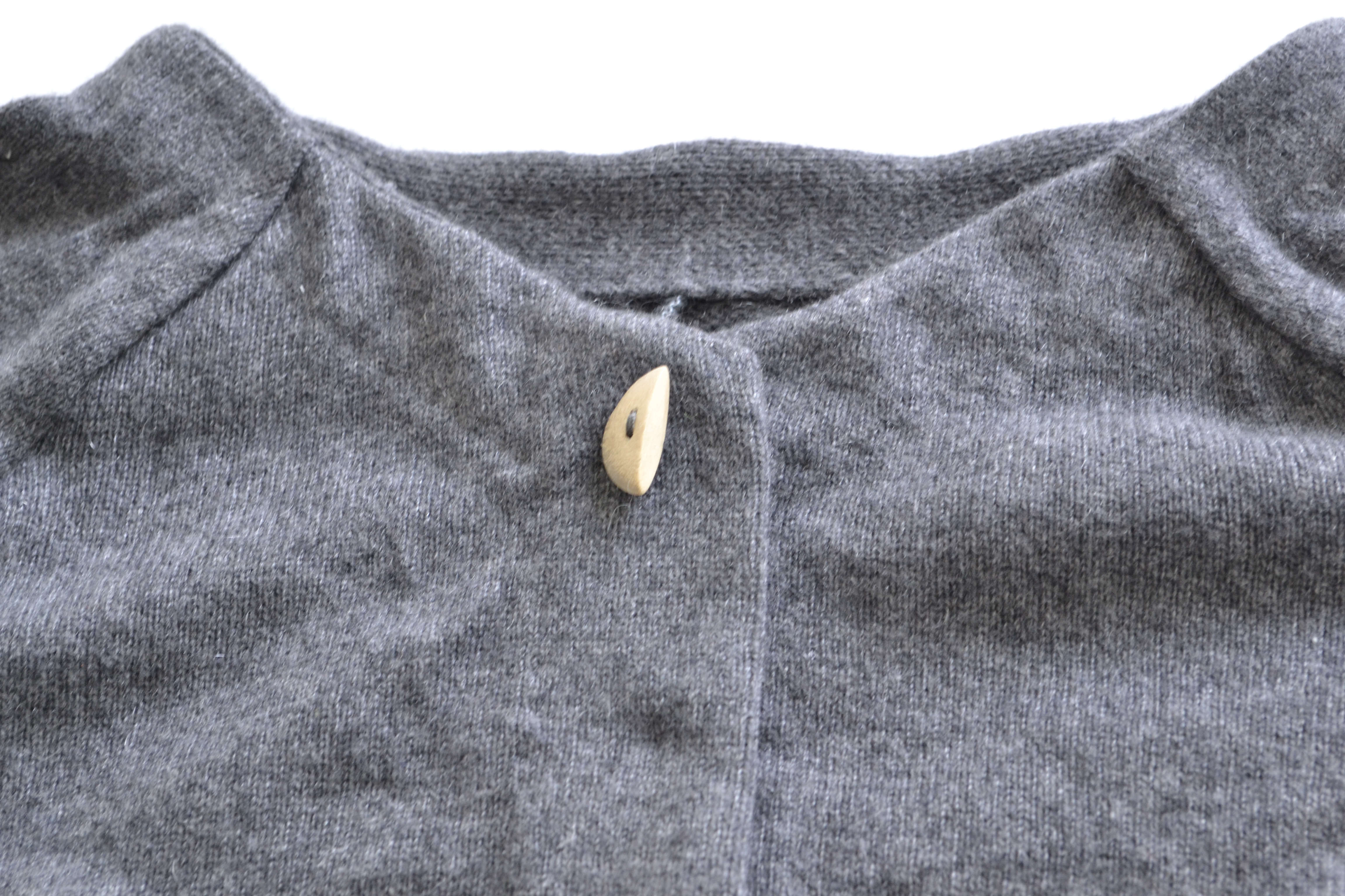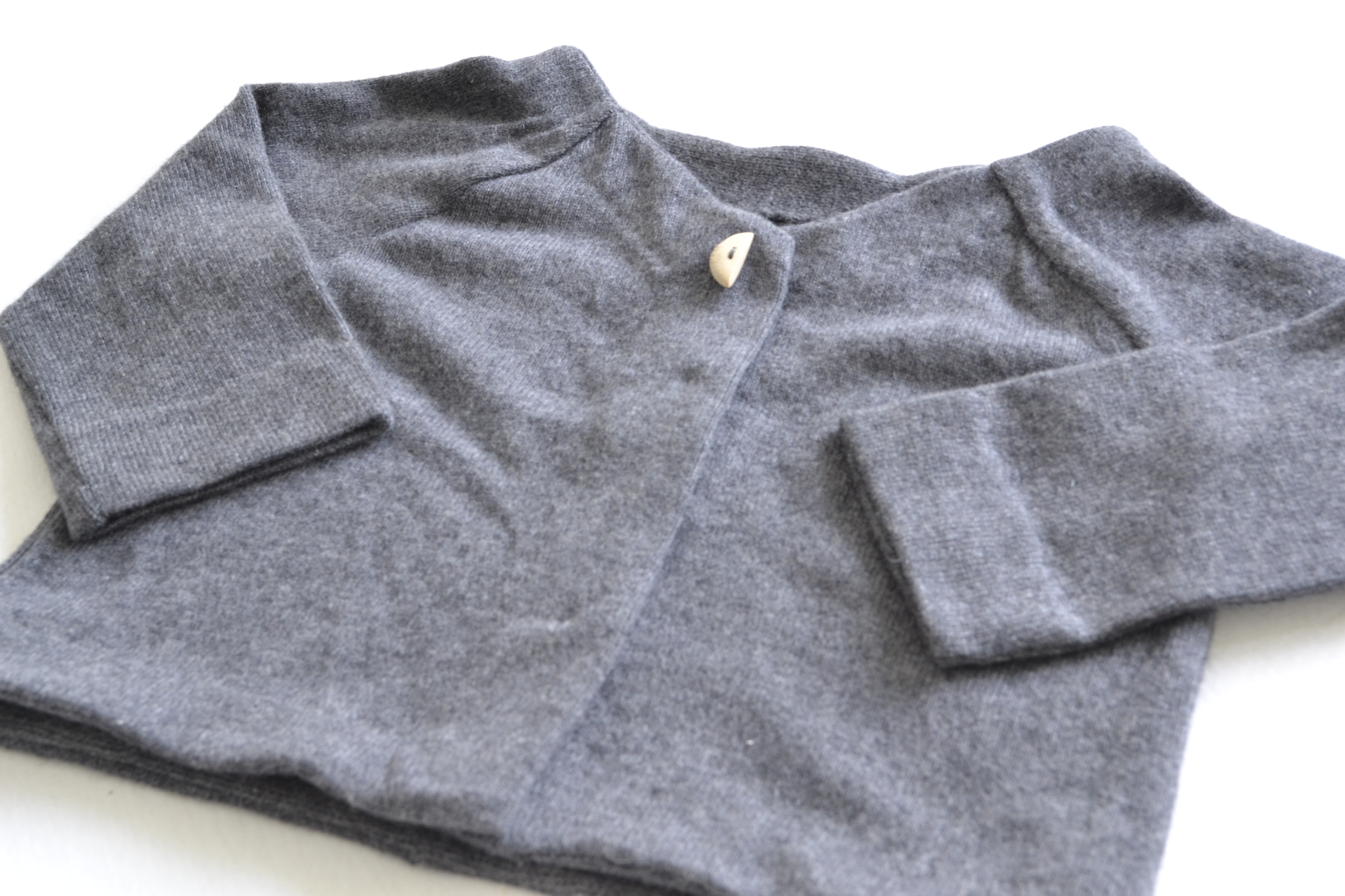Auf Wunsch meiner Schwägerin, ist dieses nette Jäckchen entstanden. Eine alte Kashmir-Strickjacke von ihr, hielt als Stoff her. Dann ging es los mit einem Schnitt von mir wurde aus der alten, teilweise löchrigen Jacke etwas ganz neues. Das Jäckchen hat eine verdeckte Druckknopf-Leiste, der kleine Holzknopf dient zur schönen Optik.